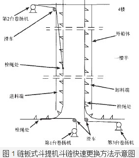 3) 在进斗链侧分别设置两个提升点, 第 1 个主动提升斗链的点设置于斗式提升机底部箱体中侧, 即在进料端和出料端中间, 其牵引钢丝绳拴在进料侧箱体外约 2 m 处, 但钢丝绳必须设置于进料侧斗链里侧, 以便于牵引; 此处设置的 1 台卷扬机通过滑车置于底部箱体侧面; 它的主要作用是将新旧斗链接头后在突破口处新斗链能匀速往进料端箱体内输送。第 2 个主动提升点设置于 4 楼进料侧观察孔处, 此处也设置 1 个滑车和 1 台卷扬机; 钢丝绳的起吊点则设置于 1 楼半的进料端侧, 此钢丝绳置于进料端料斗开口侧, 用以匀速向上提升进料侧料斗。第 3 个拖拉点设置于出料端正前方外侧, 用以拖拉在重力作用下向下滑动移出的旧斗链; 此处钢丝绳的牵引点是在该段斗链的最前方。